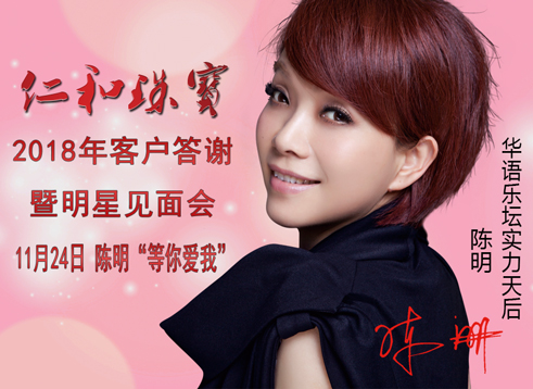 2018仁和珠宝客户答谢暨明星见面会,11月24日席卷曲靖! 陈明,中国内地女歌手,华语乐坛实力天后! 1993年推出首张专辑《相信你总会被我感动》,1994年参加青年歌手大奖赛,获专业组通俗唱法优秀奖,并推出第二张专辑《寂寞让我如此美丽》,让陈明广为熟知 。也是“94新生代”南方阵营的主力