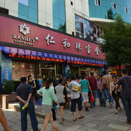五一——国际劳动节,这是一个全世界劳动人民的节日。这个小长假,劳动人民难得放松,带上家人,出来逛街购物。在这个全民放松的节日里,仁和珠宝装扮店面并精心准备了各式的珠宝首饰,使大家在一个节日气氛里愉快的购到称心如意的货品。在此祝愿全民劳动节快乐! 百大店劳动节装饰 店面装饰气氛 顾客