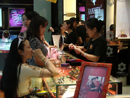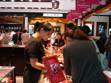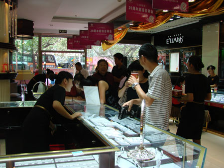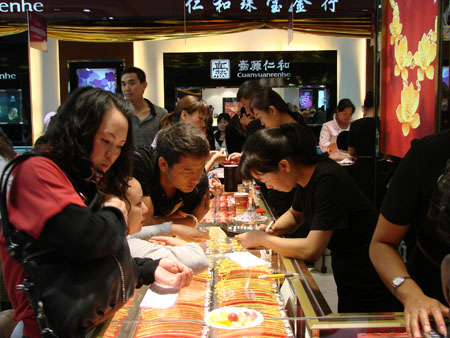 翡翠柜台挑选的顾客络绎不绝