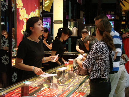 导购员为顾客所挑选的黄金首饰开单